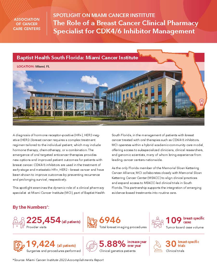 This program spotlight examines the dynamic role of a clinical pharmacy specialist at Miami Cancer Institute (MCI), part of Baptist Health South Florida, in the management of patients with breast cancer treated with oral therapies such as CDK4/6 inhibitors.