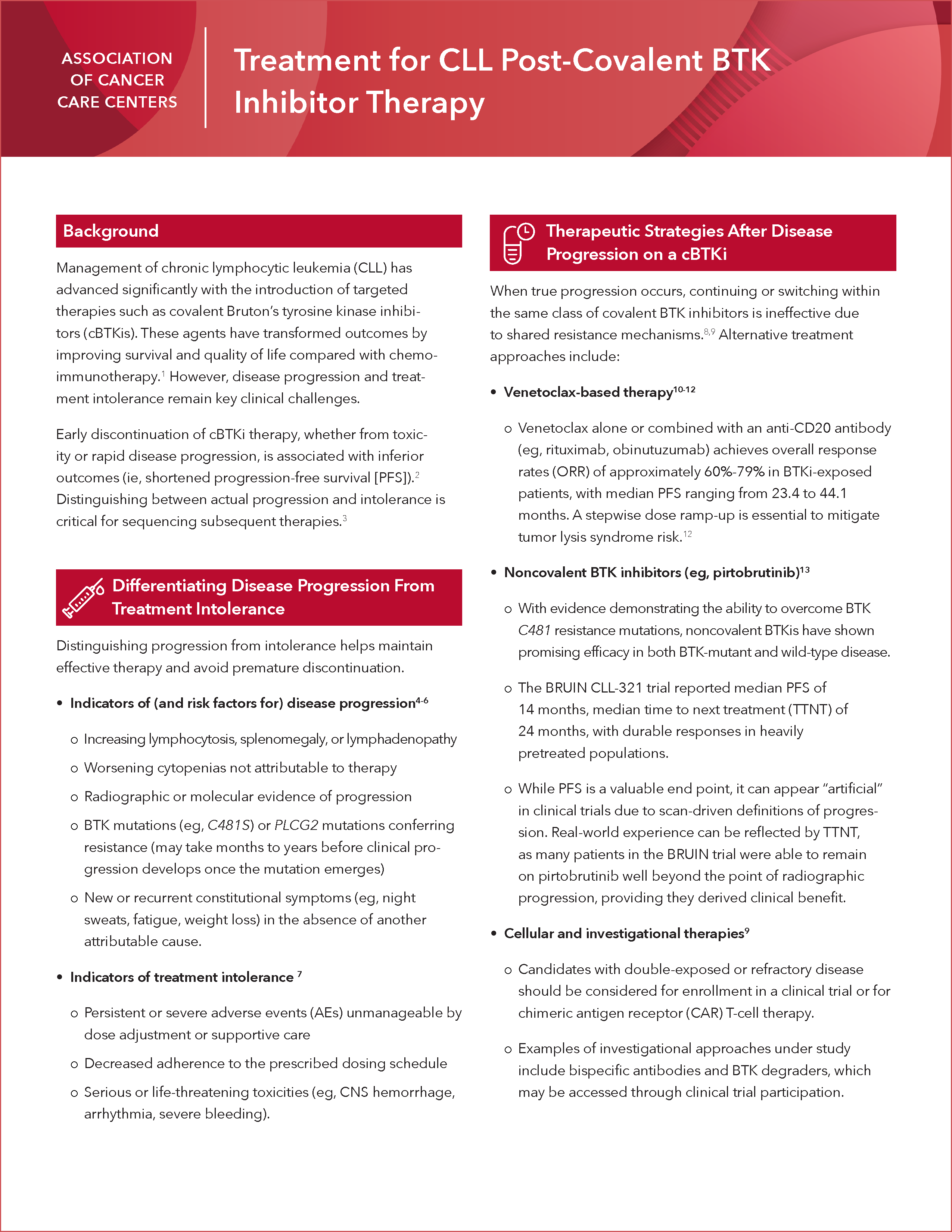 Navigate treatment decisions after covalent Bruton’s tyrosine kinase (BTK) inhibitor therapy with this evidence-based resource for CLL care. Receive clear guidance to distinguish progression from intolerance, optimizing next-line therapy selection.