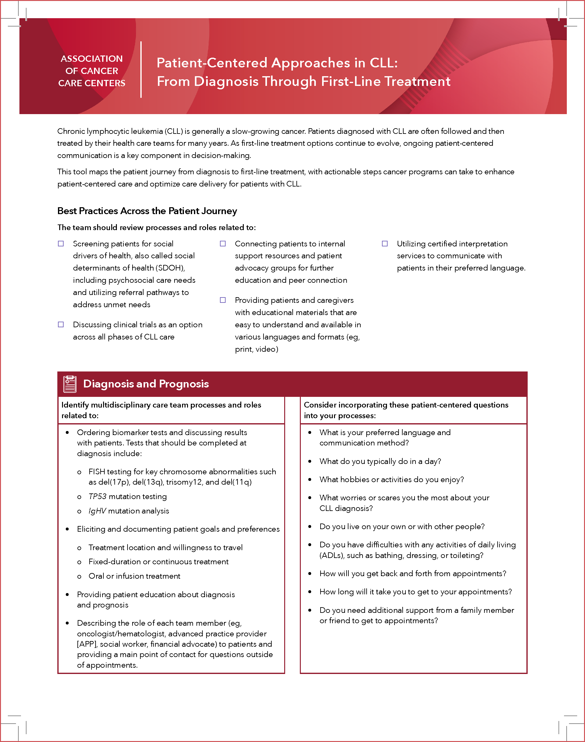 This patient journey tool outlines best practices for patient-centered CLL care from diagnosis through treatment initiation. Download strategies for aligning clinical processes with patient goals, preferences, and supportive care needs.