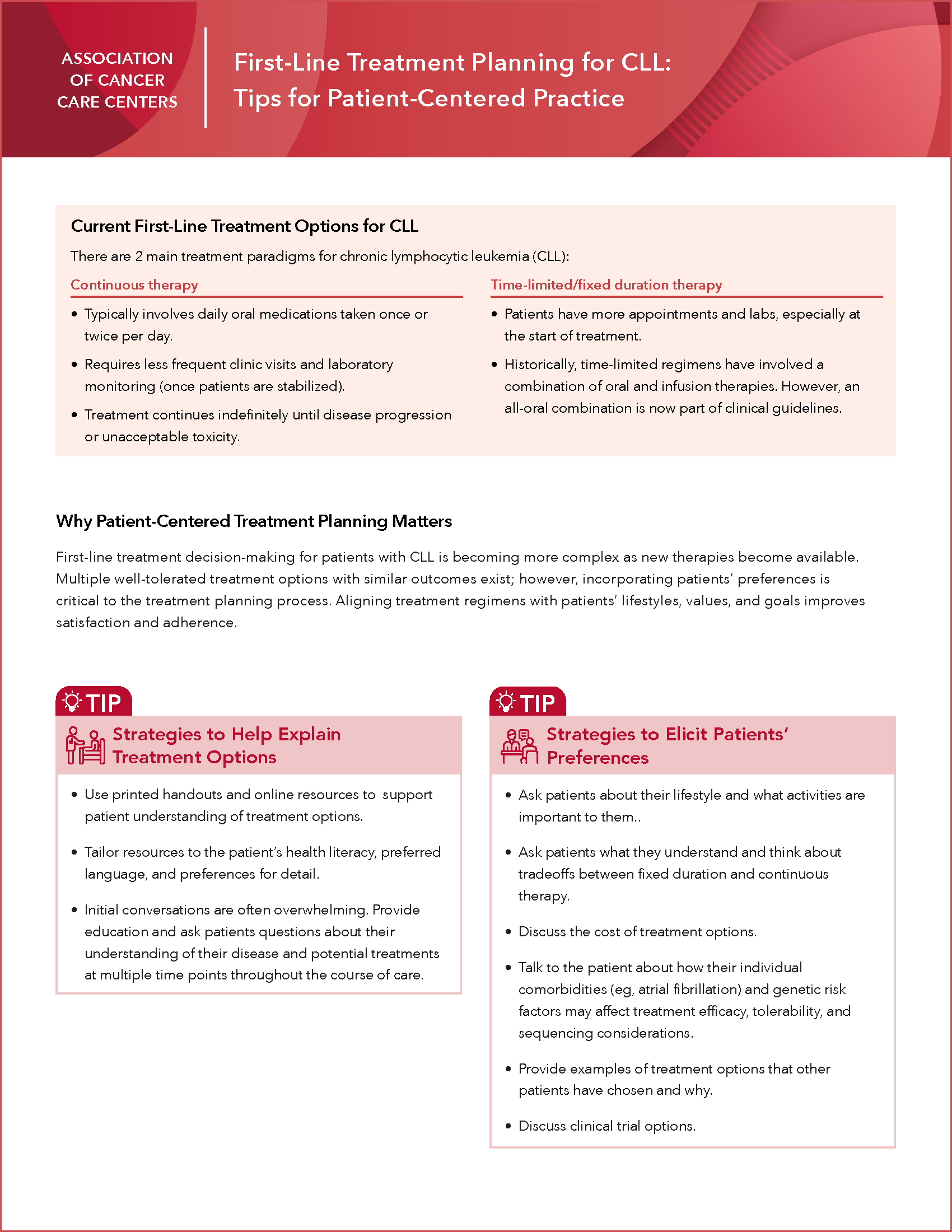 Explore practical, patient-centered first-line CLL treatment strategies. Download this tip sheet for actionable guidance on explaining treatment options, eliciting patient preferences, and navigating clinical trial discussions.